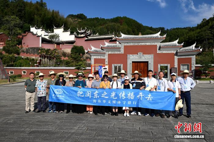9月14日,“把闽东之光传播开去”——海外华文媒体宁德行活动走进福建宁德,领略闽东的锦绣河山,感知闽东的灿烂文化,此次活动共有12国16家海外华文媒体代表前来参访。图为海外华文媒体代表在古田县临水宫祖庙前合影留念。中新社记者 吕明 摄