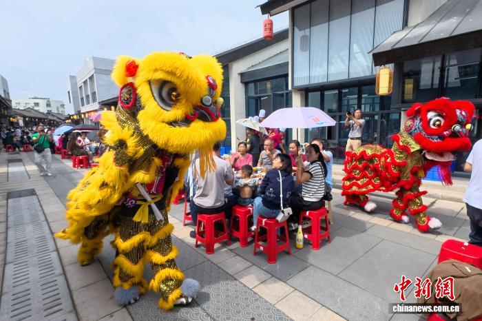 9月27日,四川省眉山市东坡区太和老镇,随着三声“开宴啰”响起,长街宴正式开席。现场50余张桌子座无虚席,凉拌鸡、东坡肘子、太和鲫鱼等经典菜肴依次上桌,吸引了400多名食客沉浸式体验这场充满烟火气的长街宴。图为太和老镇长街宴现场狮灯巡游。中新社记者 刘忠俊 摄