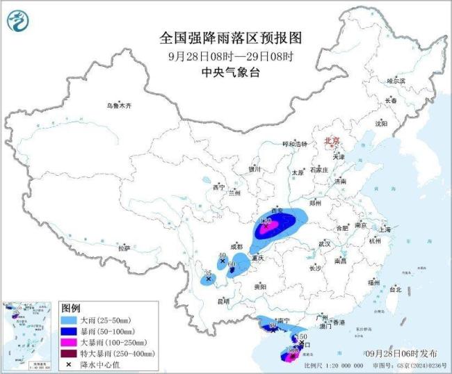 降水方面,28日8时至29日8时,广西南部、广东西南部、海南岛等地部分地区有大到暴雨,其中海南岛中南部等地部分地区有大暴雨,海南岛东南部局地可能出现特大暴雨(250-280毫米)。同时,四川东部和南部、陕西南部、河南西部、湖北西北部、重庆西部和北部、云南北部等地部分地区也有大到暴雨,陕西南部、四川盆地北部、海南岛中南部等地部分地区有大暴雨,海南岛东南部局地特大暴雨(250~280毫米)。上述部分地区伴有短时强降水(最大小时降雨量20~50毫米,局地可超过60毫米),局地有雷暴大风等强对流天气。