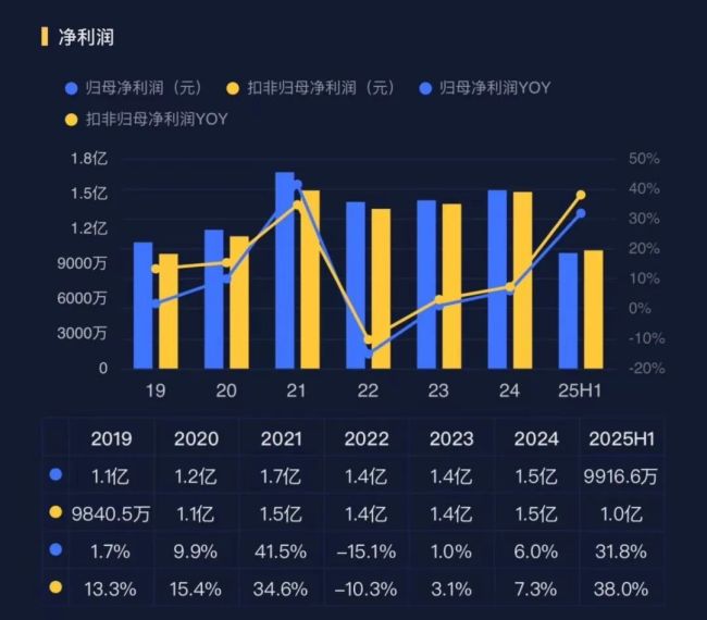 当然也不是没有隐忧,比如归母净利润从2019年的1.1亿增长至2024年的1.5亿,这期间的增长幅度明显不及营收。