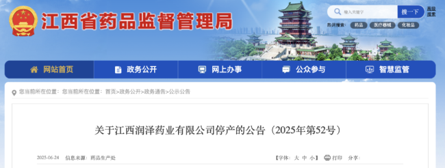 但仅1个月后,润泽药业便因资金链断裂停产,未能持续履行供应义务。江西省药监局6月发布的公告也证实,江西润泽药业有限公司因企业自身原因报告停产,停产时间为2025年6月18日至2025年10月31日。