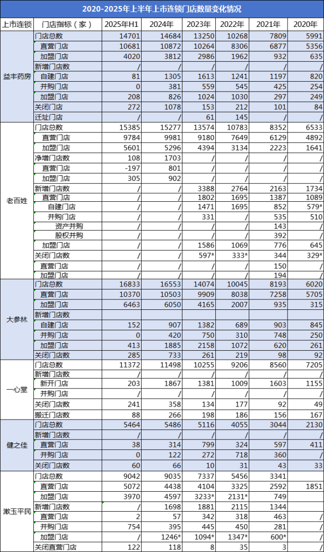 2.漱玉平民2021年上市,2020年门店数据来自《漱玉平民大药房连锁股份有限公司首次公开发行股票并在创业板上市招股说明书》。