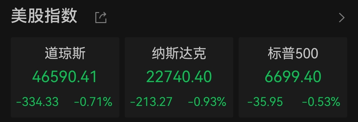 中新经纬10月23日电 美东时间周三,美股三大指数集体下跌。截至收盘,道指跌334.33点,跌幅0.71%,报46590.41点;纳指跌213.27点,跌幅0.93%,报22740.40点;标普500指数跌35.95点,跌幅0.53%,报6699.40点。