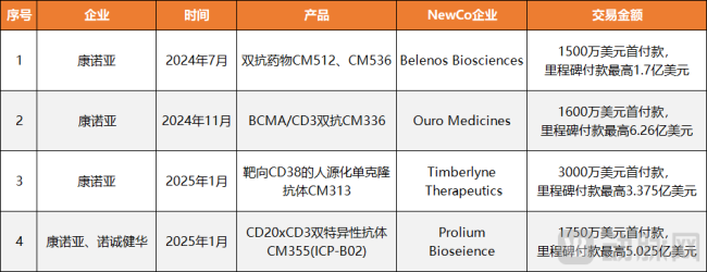 图4.康诺亚4起newco交易以及营收净利润情况