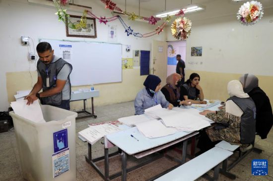 11月11日,工作人员在伊拉克巴格达一处投票站内清点选票。新华社发(哈利勒·达伍德摄)