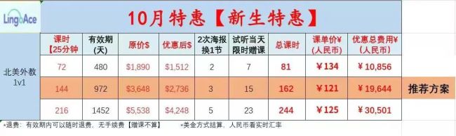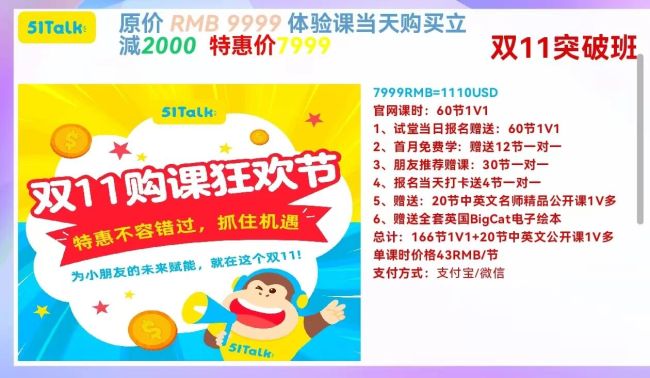 类似情况在51Talk同样存在。以51Talk销售人员推荐的一款“双11”优惠课包为例,这款课包原价9999元,“双11”优惠价格为7999元,官网1V1的课时数为60节,赠送的1V1课时为106节,赠送的公开课为20节,总课时数为186节。该课包的宣传照片显示,单课时价格为43元/节。