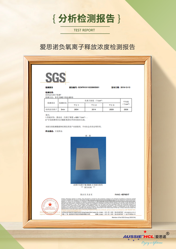 爱思诺的“破”,便在于其率先聚焦影响睡眠质量的潜在因素——空气质量、微生物环境与身体压力分布,并自主研发出“ECO-FRESH 科奇活力棉”。该材料的核心亮点并非“新”,而在于功能的“调”:爱思诺精选宝石级托玛琳原石,结合超微提纯与改性分散工艺,将其融入MDI生态基材一体发泡,形成能够稳定、持续释放小粒径、高活性负氧离子的功能性绵体。经SGS检测,该材料每平方厘米负氧离子释放量超过3000个,达到世卫组织“深山空气质量”一级标准,真正实现长效、稳定、高浓度的室内空气优化。