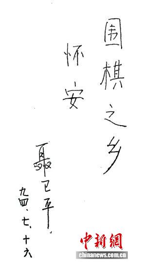 图为聂卫平为怀安题写“围棋之乡”。受访者供图。