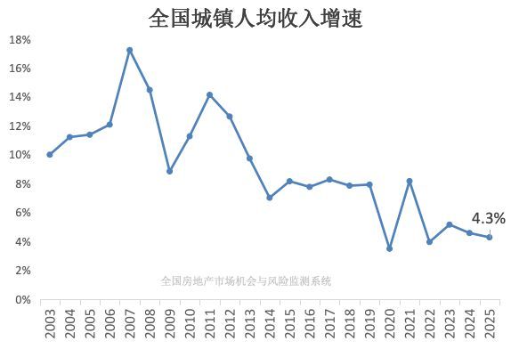 收入数据基于统计局公布的2025年度全国城镇地区人均可支配收入,按三口之家计算出家庭总收入。房价则依据统计局发布的2025年全国新建商品住宅单价,以100平米户型计算得出一套房子的总价。