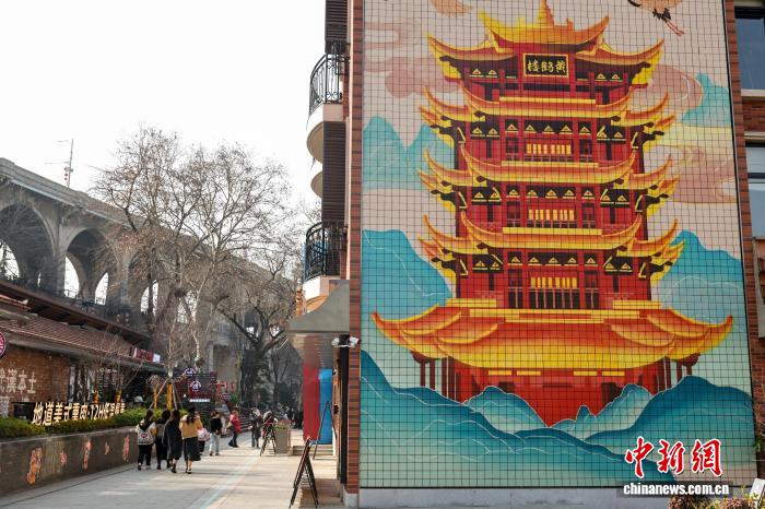 2月12日,湖北武汉,春节将至,武昌古城斗级营街区张灯结彩,处处洋溢着喜庆祥和的节日氛围。街区精心打造“抬头见黄鹤楼”的特色打卡场景,还可与武汉长江大桥同框,吸引大批市民游客前来打卡游玩。图为游客在武昌斗级营街区游玩。中新社记者 张畅 摄