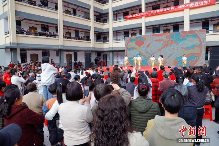 2月12日,一场接地气、有温度的迎新春“村晚”在福建省顺昌县高阳乡幸福里社区操场热闹开演。村民自编自导自演,歌舞、小品等节目轮番登场,用质朴表演展现乡村新风貌,现场掌声不断、欢声笑语洋溢。活动同步开展写春联、义剪、健康体检等便民服务。图为“村晚”小品。朱城铖 摄