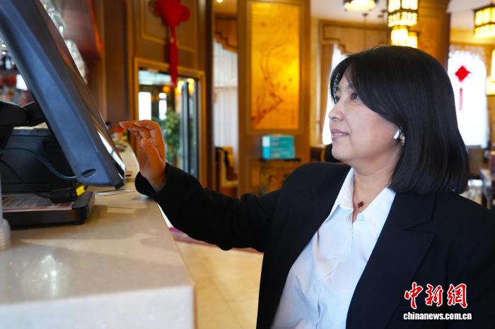 3月19日,哈萨克斯坦阿斯塔纳,古丽努尔在中餐厅“公主饭店”前台工作。中新社记者 单璐 摄