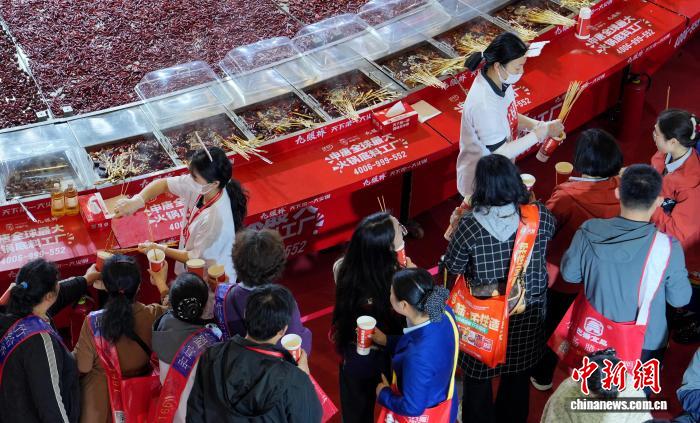 图为工作人员往火锅里下食材。中新社记者 安源 摄