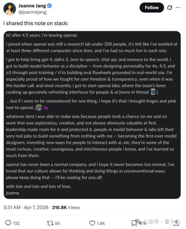 GPT-4o之母宣布离职OpenAI 告别灵魂工程师。Joanne Jang,被称为GPT-4o的灵魂工程师,宣布结束在OpenAI四年半的工作。她在一篇长文中表示,离开OpenAI后将不再解释原因或透露下一步计划。Joanne形容自己在OpenAI的时光如同在三家不同的公司工作过,但每一段都特别开心。她特别提到,希望人们记住她把青蛙meme和粉色字体带进了OpenAI。