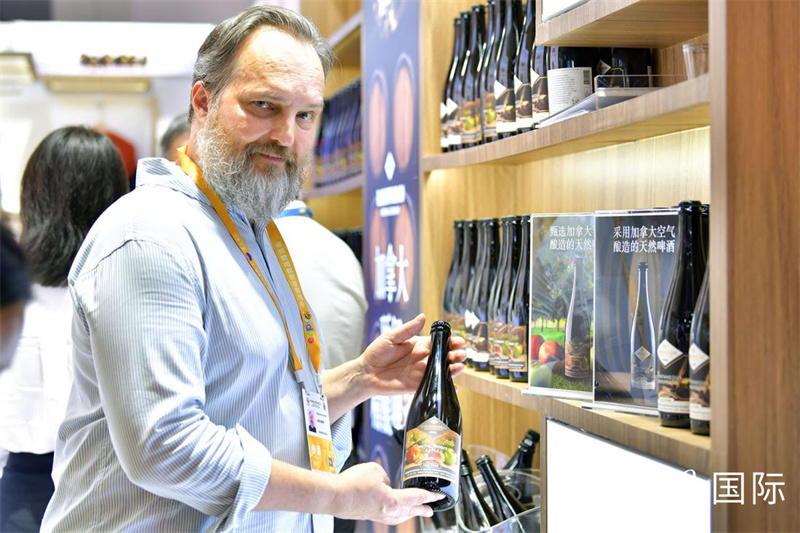 一名展商正在展示产自加拿大的苹果啤酒。人民网记者 任峰涛摄