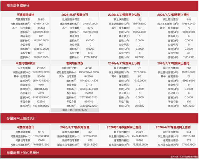 北京市住建委官网数据显示,4月27日北京新房网签402套,网签面积25912.3平方米,其中住宅网签124套,网签面积15993.85平方米;二手房网签944套,网签面积81611.55平方米,其中住宅网签872套,网签面积77402.49平方米。