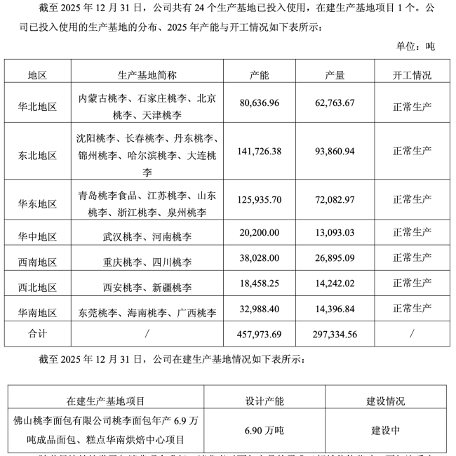 根据财报显示,截至2025年末,桃李面包共有24个生产基地已投入使用,在建生产基地项目1个。