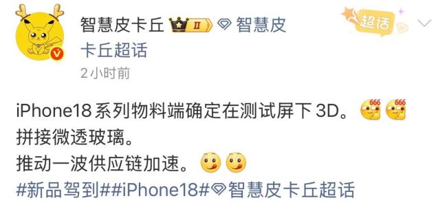 博主智慧皮卡丘透露,iPhone 18 系列正在测试屏下3D人脸识别技术。爆料中提到的“拼接微透玻璃”工艺也引人关注,这可能意味着机身设计将有创新。供应链已经开始为iPhone 18系列加速备货