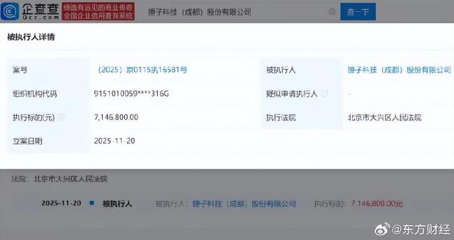 11月25日,企查查APP显示锤子科技(成都)股份有限公司新增一条被执行人信息,执行标的约715万元,执行法院为北京市大兴区人民法院
