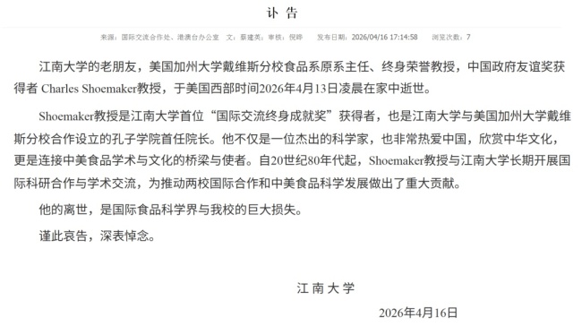 4月16日,江南大学发布讣告,宣布美国加州大学戴维斯分校食品系原系主任、终身荣誉教授Charles Shoemaker教授于美国西部时间2026年4月13日凌晨在家中逝世