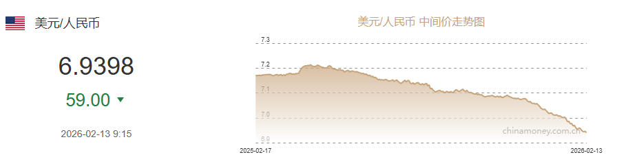 2月13日人民币对美元中间价报6.9398 上调59个基点
