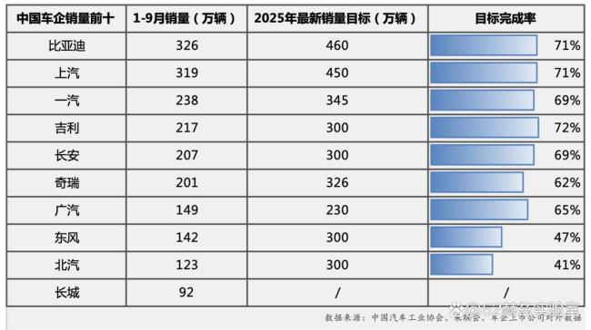前三季度中国车企最新销量数据公布,整体行业表现稳健。根据汽车行业协会的数据,2025年前三季度汽车行业继续保持稳中向好的发展态势。比亚迪和上汽集团位居前列。比亚迪1-9月销量达到326万辆,完成全年460万辆目标的71%