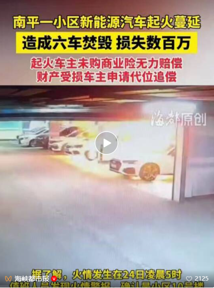 地库内新能源车起火致6辆车焚毁 火灾引发赔偿争议