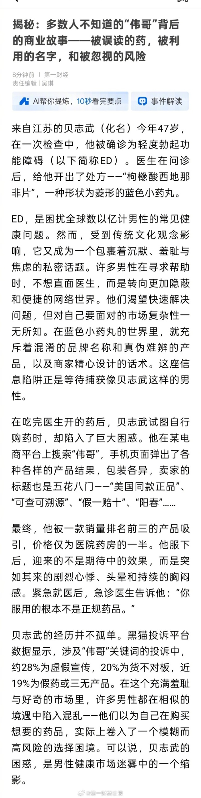 近两成投诉者称买到假伟哥!涉及“伟哥”关键词的投诉中近19%为假药或三无产品