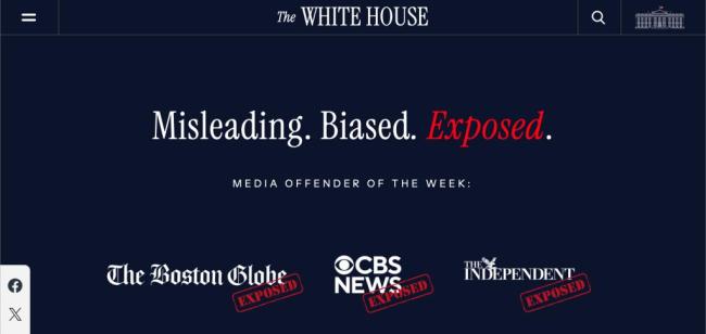 白宫再次针对媒体采取行动。11月28日,美国白宫网站新增了一个页面,推出“媒体偏见追踪”功能,列出了一些媒体名称、记者姓名及其所谓的“罪名”,以及所谓的“真相”和“信息来源”等内容,并特别设计了“违规媒体耻辱榜”