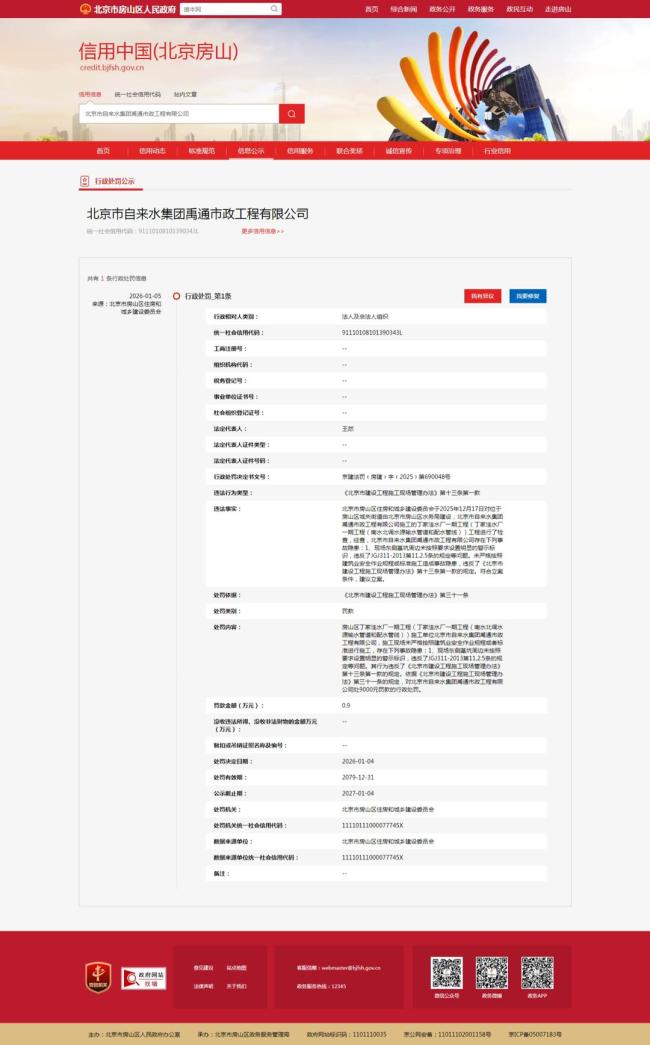 北京市自来水集团禹通市政工程有限公司因施工安全问题被罚款。据信用中国(北京房山)行政处罚栏公示,该公司于1月5日收到罚单。北京市房山区住房和城乡建设委员会在2025年12月17日对位于房山区城关街道的丁家洼水厂一期工程进行了检查