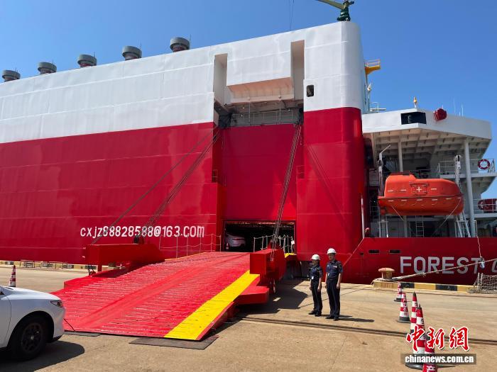 图为海事部门工作人员在现场进行保障工作。为保障航线顺利开通和滚装船首航成功,温州海事部门联合多家单位,制定“一船一策”保障方案,开辟24小时“优先查验”绿色通道,实施“远程预检+登轮检查”等,全方位保障